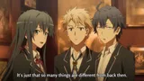 Hachiman bears witness as Yui tries to either fit in or break away from her social group. Later, the club receives a new request from an old friend of Hachiman’s.